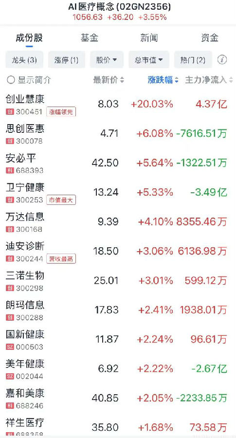 3月10日,AI醫(yī)療概念股迎來大漲。A股方面,塞力醫(yī)療、潤達醫(yī)療、創(chuàng)業(yè)慧康等封板漲停,思創(chuàng)醫(yī)惠、安必平、衛(wèi)寧健康、迪安診斷、美年健康等漲幅靠前。港股方面,方舟健客、訊飛醫(yī)療、醫(yī)渡科技等也迎來不同程度的上漲。在業(yè)內(nèi)看來,AI醫(yī)療板塊的異?;钴S是受到華為在消息面上的提振。
