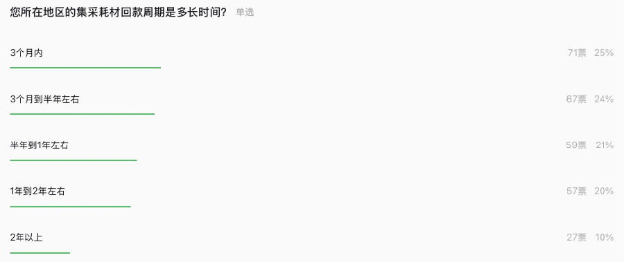 此前,賽柏藍(lán)器械曾對耗材回款周期展開小范圍調(diào)研,共281人參與投票。投票結(jié)果顯示,集采耗材回款情況明顯好于非集采耗材,49%的參與者表示,集采耗材回款周期能控制在半年內(nèi),但也有84位參與者表示,其業(yè)務(wù)相關(guān)耗材回款周期來到了1年以上。