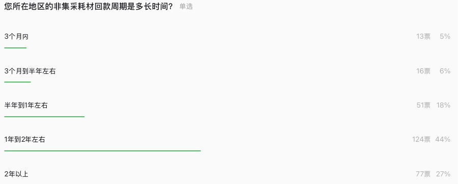 非集采耗材回款周期則更長,多數(shù)在1-2年之間。不過也有13位參與者表示,其非集采耗材回款可在3個(gè)月內(nèi)實(shí)現(xiàn)。