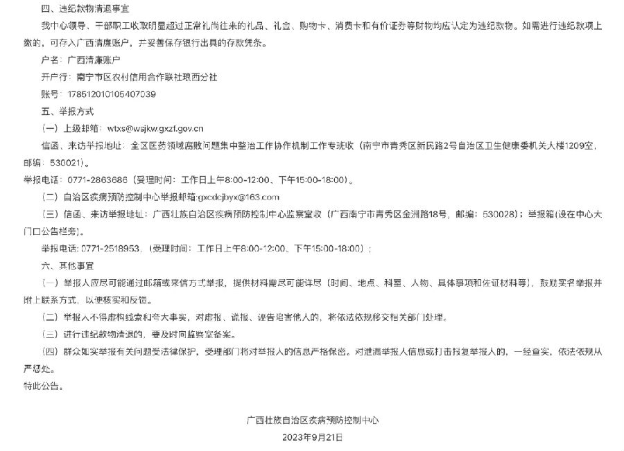 2023年,廣西自治區(qū)疾控中心在展開醫(yī)藥領(lǐng)域腐敗問題集中整治工作時也曾就違紀(jì)款物清退等公開了清廉賬戶及舉報方式,并在公告中明確,單位領(lǐng)導(dǎo)、干部職工收取明顯超過正常禮尚往來的禮品、禮金、購物卡、消費卡和有價證券等財物均應(yīng)認(rèn)定為違紀(jì)款物。
