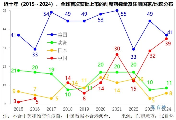 同期,美國批準的創(chuàng)新藥數(shù)量與其9年前的持平,仍是41個;歐洲較9年前近乎腰斬,2015年的21個下降到了2024年的11個,由全球第2位下滑到第3位;2024年,批準了8個創(chuàng)新藥,較9年前2015年的還少了1個,全球排名由第3位下降到第4(詳見下圖)