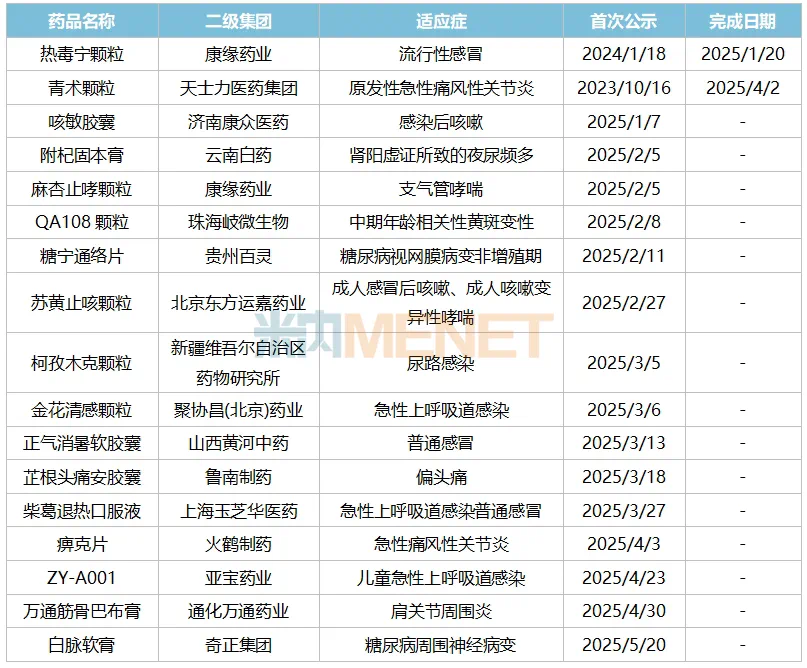 康緣藥業(yè)的熱毒寧顆粒是其獨(dú)家產(chǎn)品熱毒寧注射液的改變給藥途徑和劑型研發(fā)的口服制劑,用于治療流行性感冒。2024年在中國三大終端六大市場,熱毒寧注射液是中成藥呼吸系統(tǒng)疾病用藥市場注射TOP5產(chǎn)品。熱毒寧顆粒在2020年4月獲得臨床批件,2025年1月完成III期臨床。據(jù)其年報(bào),熱毒寧顆粒已處于Pre-NDA階段。其另一款中藥新藥麻杏止哮顆粒用于支氣管哮喘慢性持續(xù)期(熱哮),2020年2月獲批臨床,2025年2月啟動(dòng)III期臨床,并已在3月完成了第一例入組。