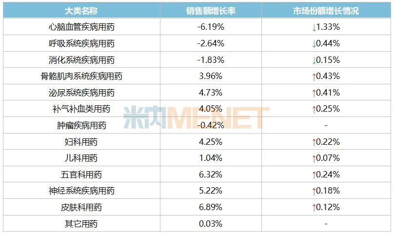 從市場份額提升情況來看,13個(gè)大類中骨骼肌肉系統(tǒng)疾病用藥、泌尿系統(tǒng)疾病用藥在2024年提升了0.4個(gè)百分點(diǎn),潛力不容小覷。