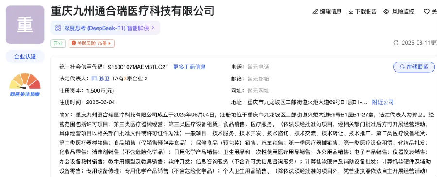 近日,九州通旗下九州通醫(yī)療器械集團(tuán)有限公司、重慶鴻貿(mào)隆企業(yè)管理咨詢有限公司共同持股成立重慶九州通合瑞醫(yī)療科技有限公司。