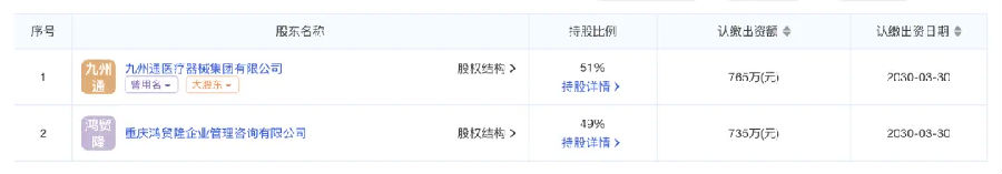 重慶九州通合瑞醫(yī)療科技有限公司注冊(cè)資本為1500萬(wàn)元,九州通醫(yī)療器械集團(tuán)有限公司認(rèn)繳出資765萬(wàn)元,持股比例為51%。其經(jīng)營(yíng)范圍包括第三類醫(yī)療器械經(jīng)營(yíng);第三類醫(yī)療設(shè)備租賃;食品銷售;醫(yī)療服務(wù)等。