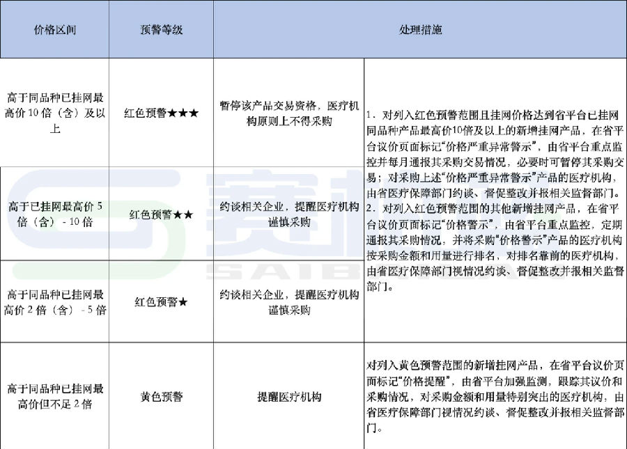 依照江蘇規(guī)定的處置措施,產(chǎn)品價格高于同品種已掛網(wǎng)最高價5倍(含)-10倍觸發(fā)“紅二星”預(yù)警,高于同品種已掛網(wǎng)最高價2倍(含)-5倍觸發(fā)“紅一星”預(yù)警,均面臨價格預(yù)警、重點監(jiān)控,提醒醫(yī)療機構(gòu)謹(jǐn)慎采購;高于已掛網(wǎng)最高價但不足2倍觸發(fā)黃色預(yù)警的,也將推送價格提醒、加強監(jiān)測。